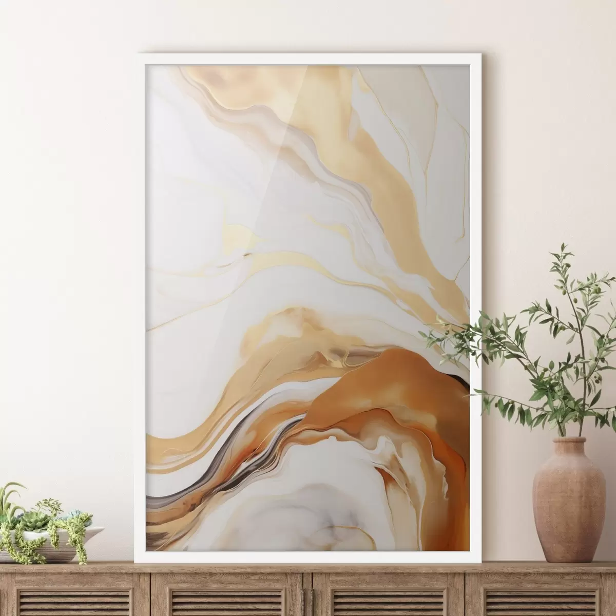 Plakatas Abstraktaus tapybos imitacija su sklandžiomis formomis balto, oranžinio ir rudo atspalvių, minimalistinė Ne f45938
