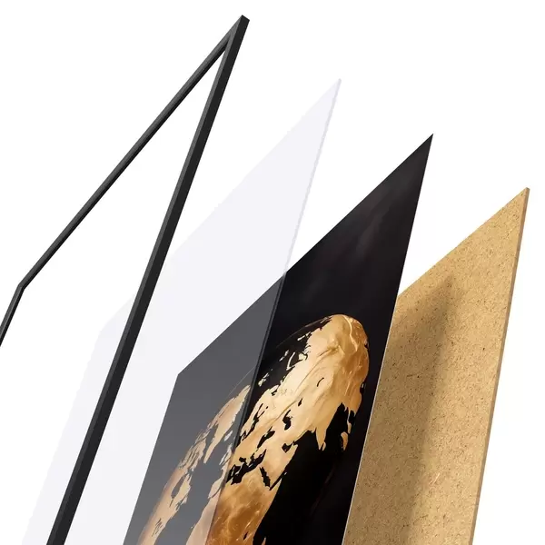 Plakatą sudaro rėmas, pleksiklas, atspausdintas vaizdas ir medžio drožlių plokštės pagrindas. Plakatą galima iš karto pakabinti ant sienos dėl kitoje pusėje esančių laikiklių.