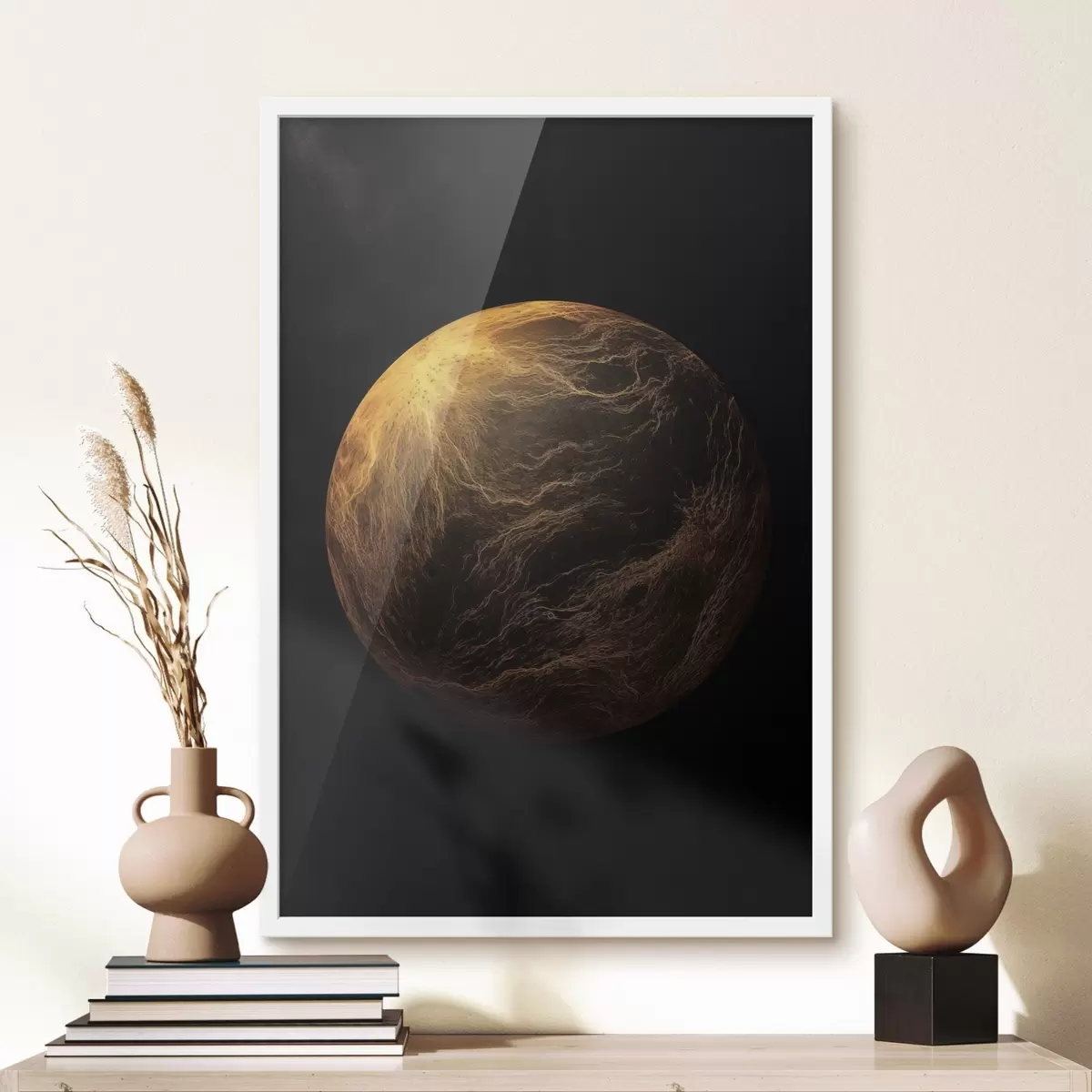 Plakatas Abstraktaus planetos su oranžinėmis gyslomis juodame kosmoso fone, modernus minimalistinis menas Ne f45943