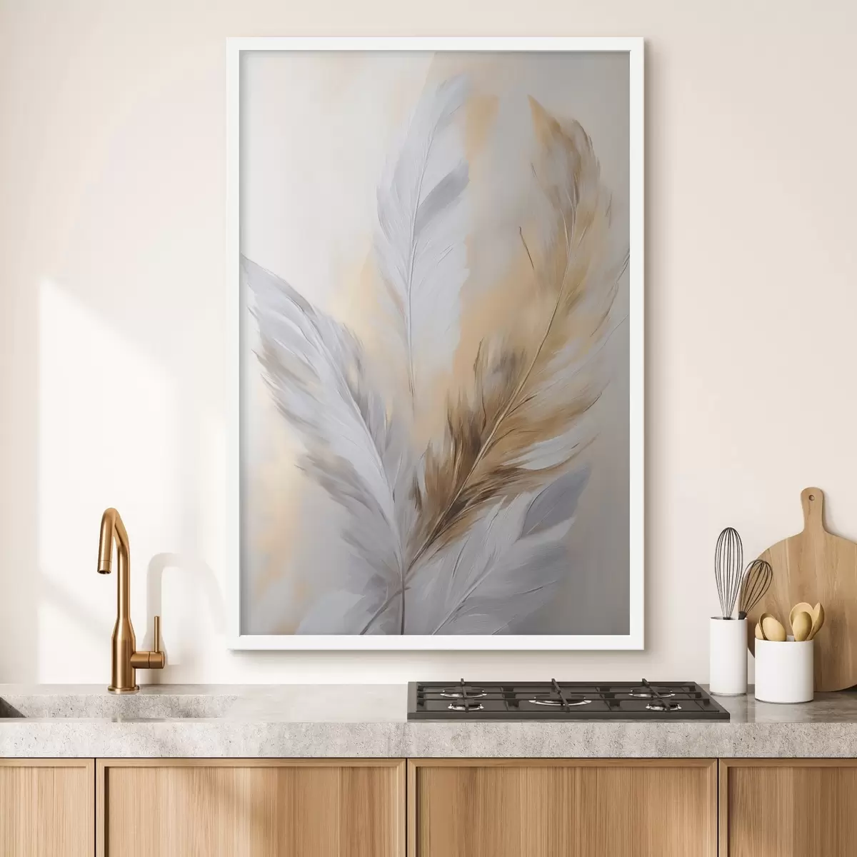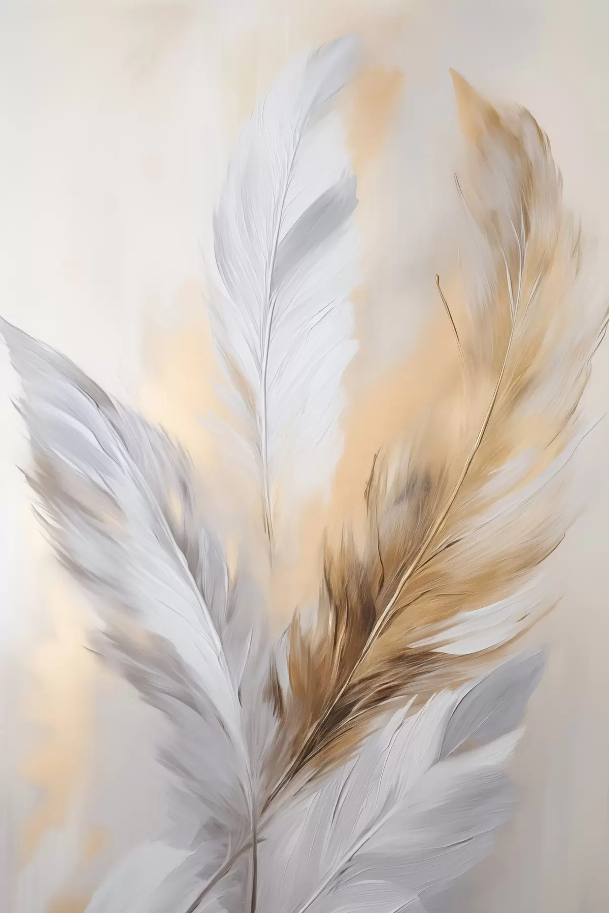 Plakatas Plunksnos su oranžiniais akcentais, tekstūruota minimalistinė kompozicija, šiuolaikinis menas f45945