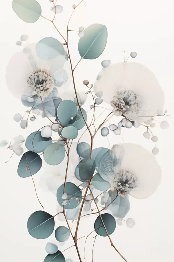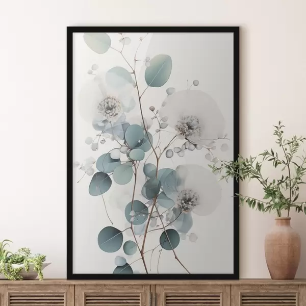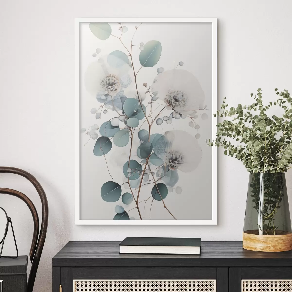 Plakatas Eukalipto abstrakčios gėlės su baltais žiedlapiais, švelniai žalios lapai ant šakų f45946