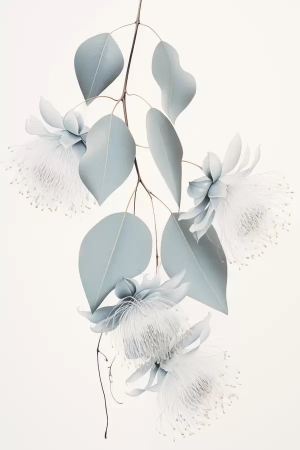 Plakatas Eukalipto šaka su mėlynais lapais ir baltais žiedais, šviesus fonas f45947