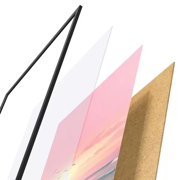 Plakatą sudaro rėmas, pleksiklas, atspausdintas vaizdas ir medžio drožlių plokštės pagrindas. Plakatą galima iš karto pakabinti ant sienos dėl kitoje pusėje esančių laikiklių.