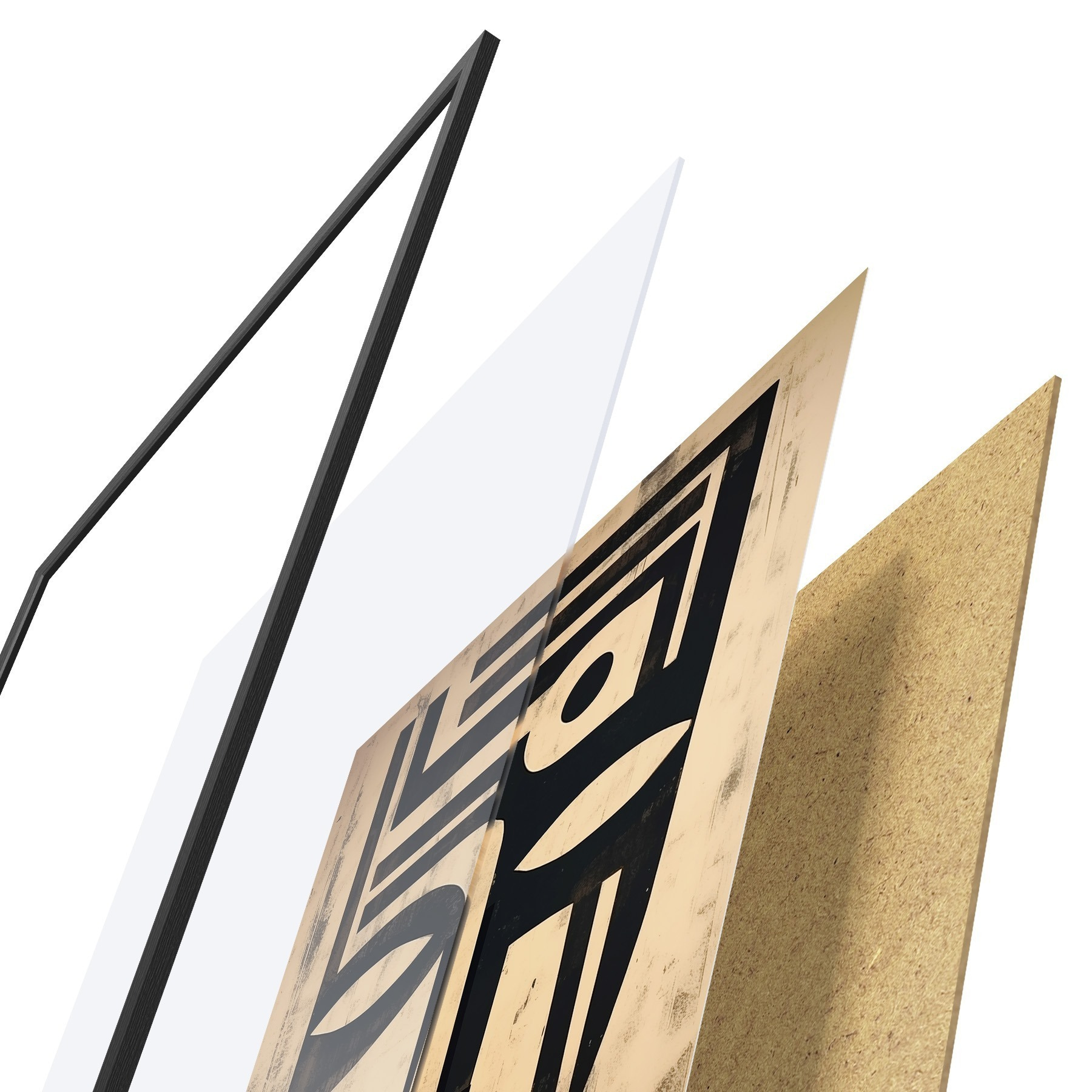 Plakatą sudaro rėmas, pleksiklas, atspausdintas vaizdas ir medžio drožlių plokštės pagrindas. Plakatą galima iš karto pakabinti ant sienos dėl kitoje pusėje esančių laikiklių.