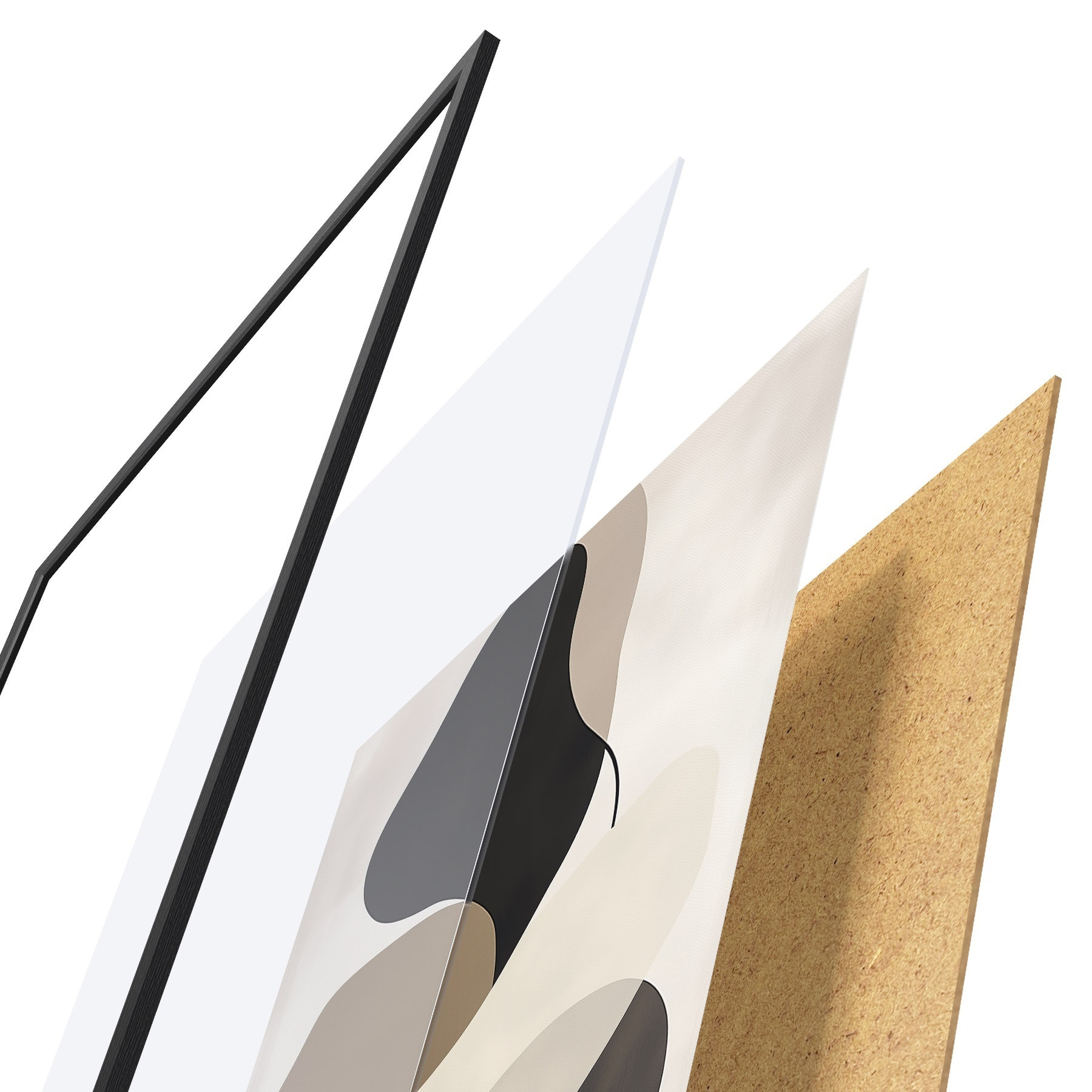 Plakatą sudaro rėmas, pleksiklas, atspausdintas vaizdas ir medžio drožlių plokštės pagrindas. Plakatą galima iš karto pakabinti ant sienos dėl kitoje pusėje esančių laikiklių.