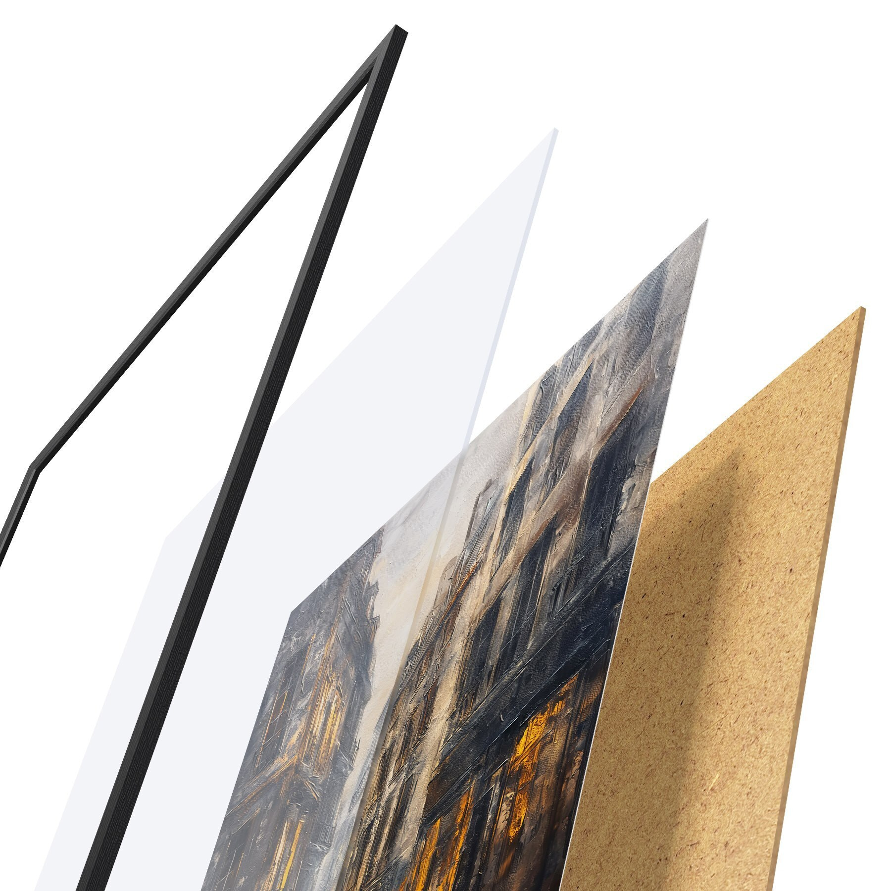Plakatą sudaro rėmas, pleksiklas, atspausdintas vaizdas ir medžio drožlių plokštės pagrindas. Plakatą galima iš karto pakabinti ant sienos dėl kitoje pusėje esančių laikiklių.