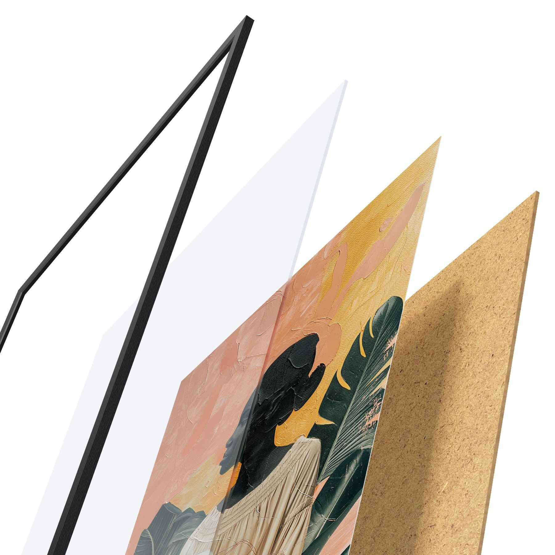 Plakatą sudaro rėmas, pleksiklas, atspausdintas vaizdas ir medžio drožlių plokštės pagrindas. Plakatą galima iš karto pakabinti ant sienos dėl kitoje pusėje esančių laikiklių.