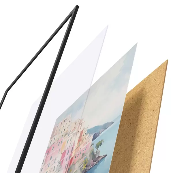 Plakatą sudaro rėmas, pleksiklas, atspausdintas vaizdas ir medžio drožlių plokštės pagrindas. Plakatą galima iš karto pakabinti ant sienos dėl kitoje pusėje esančių laikiklių.