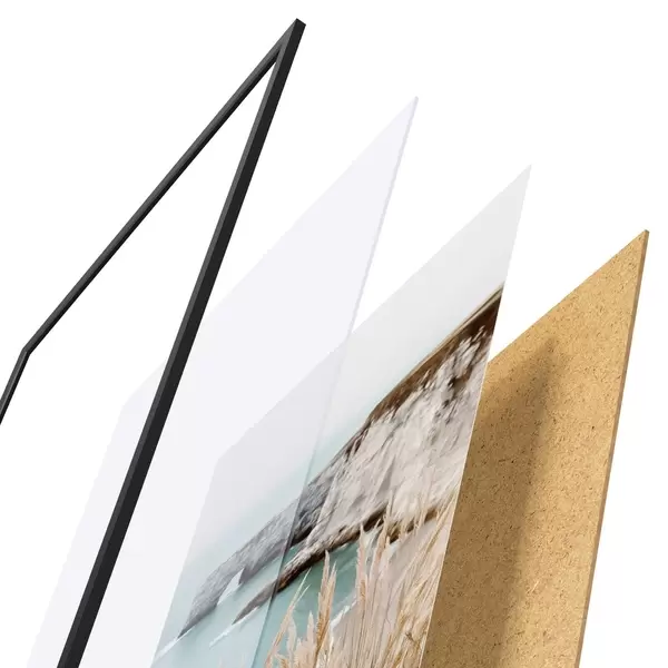 Plakatą sudaro rėmas, pleksiklas, atspausdintas vaizdas ir medžio drožlių plokštės pagrindas. Plakatą galima iš karto pakabinti ant sienos dėl kitoje pusėje esančių laikiklių.