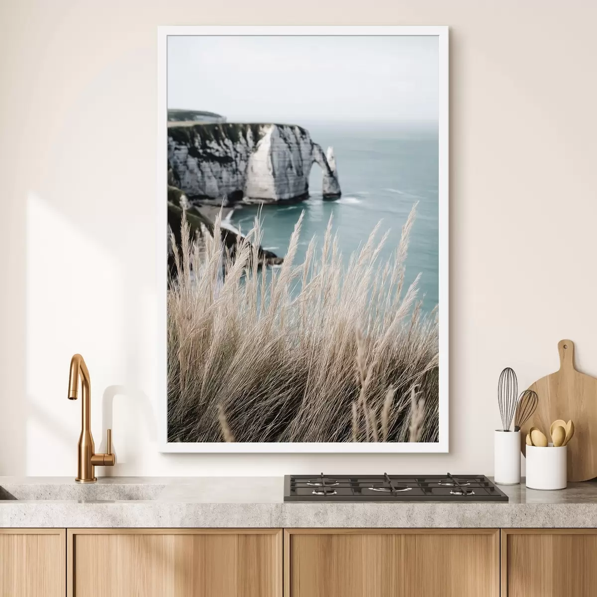 Plakatas Jūra ir uolų arka, vaizdas per sausą žolę f46142