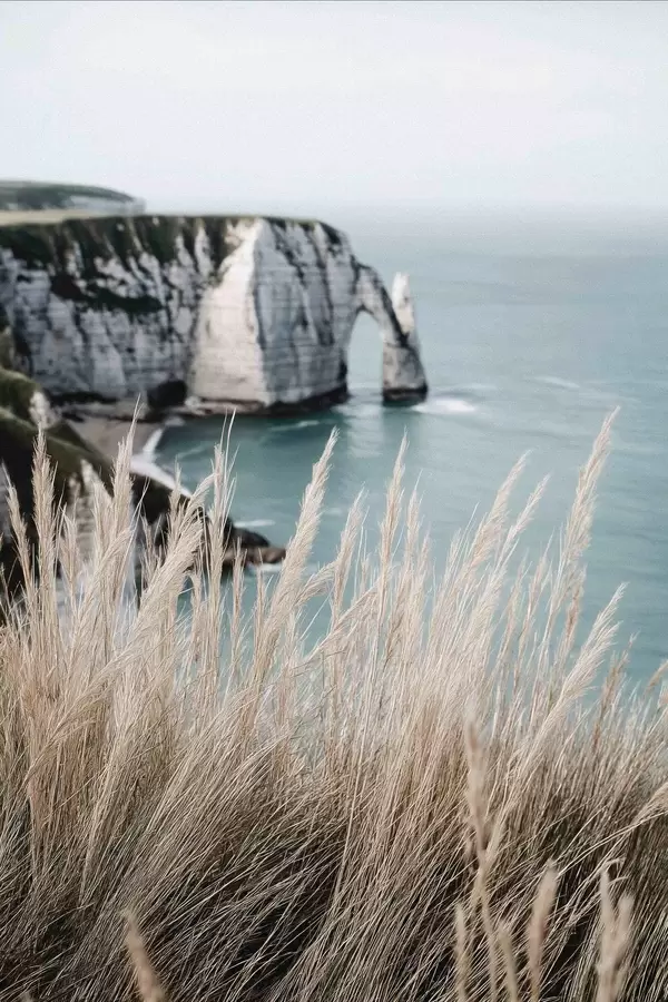 Plakatas Jūra ir uolų arka, vaizdas per sausą žolę f46142