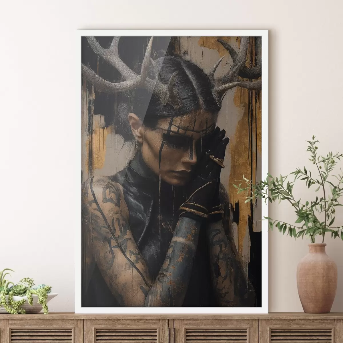 Plakatas Moteris su ragais, tamsiu žvilgsniu ir juodomis veido linijomis f46144