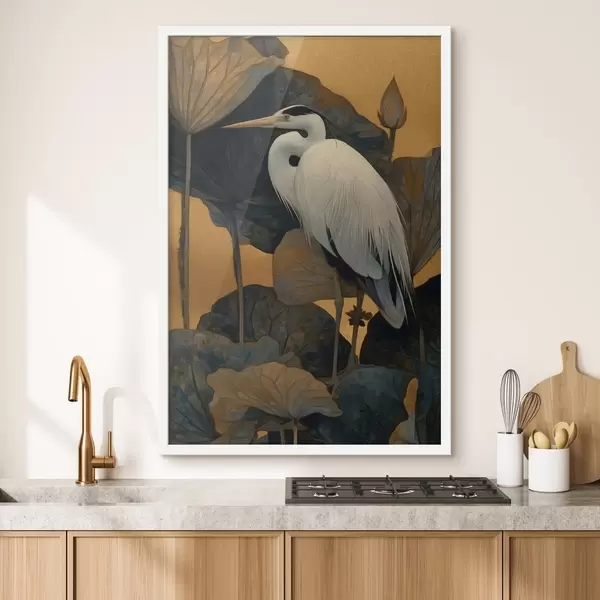 Plakatas Balta garzė tarp didelių lapų šiltame fone Ne f46147