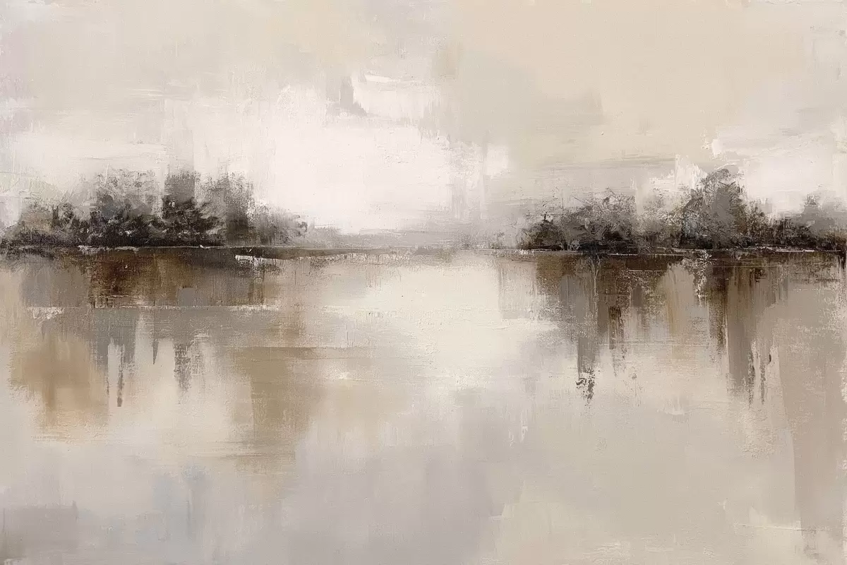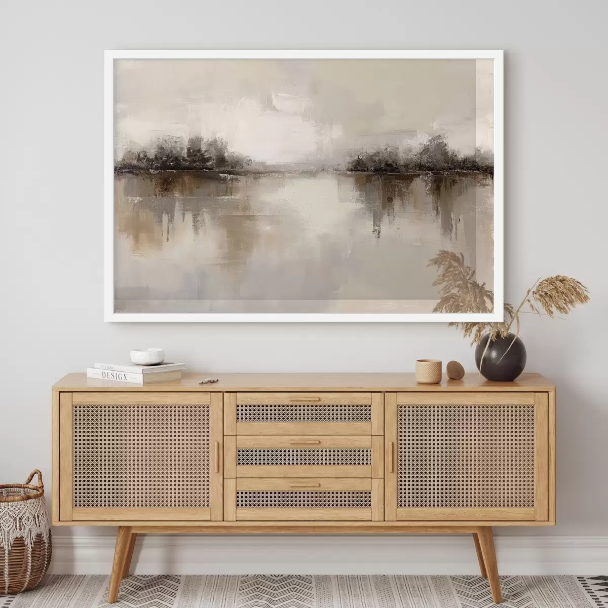 Plakatas Švelnus kraštovaizdis su ežeru šiltų smėlio-pilkų atspalvių Ne f46158