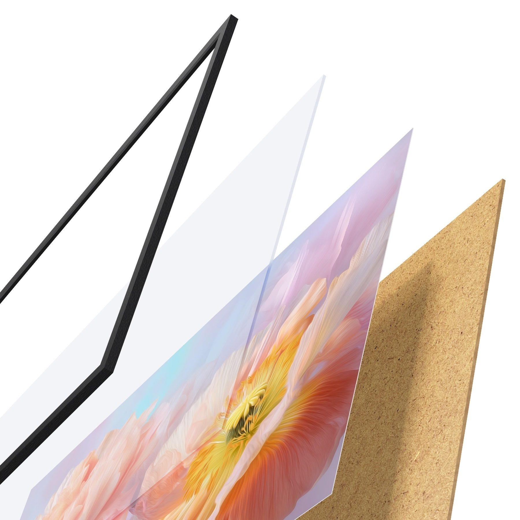 Plakatą sudaro rėmas, pleksiklas, atspausdintas vaizdas ir medžio drožlių plokštės pagrindas. Plakatą galima iš karto pakabinti ant sienos dėl kitoje pusėje esančių laikiklių.