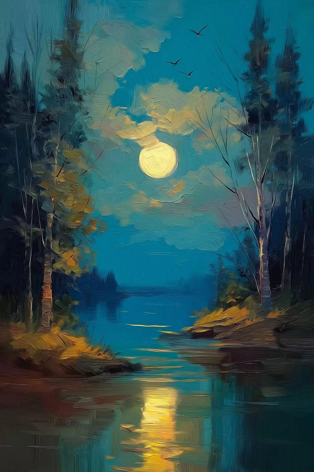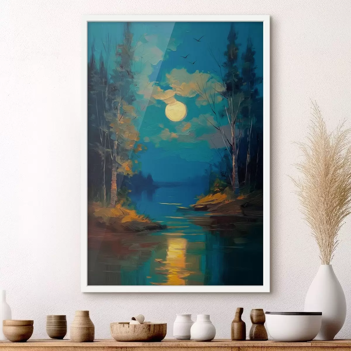 Plakatas Mėnulio šviesa virš ramios upės tarp pušų Ne f46164