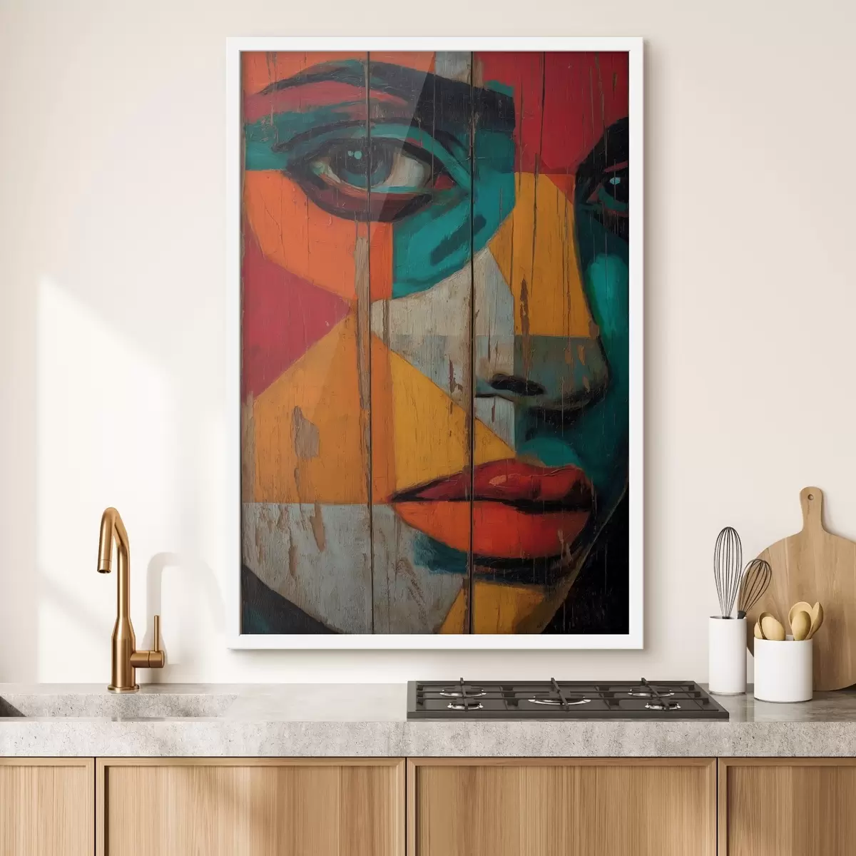 Plakatas Ryškus geometrinis veido portretas ant medinių lentų Ne f46165