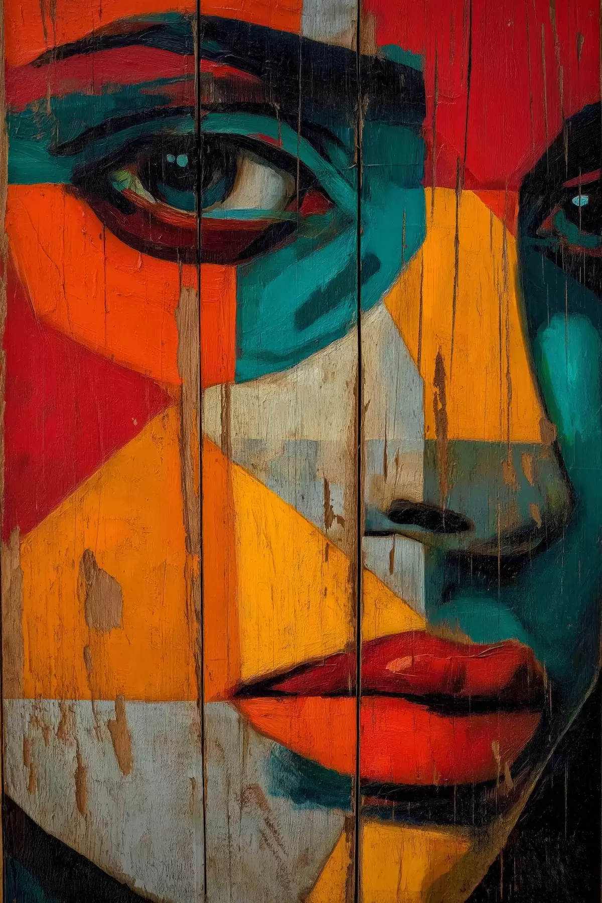 Plakatas Ryškus geometrinis veido portretas ant medinių lentų f46165