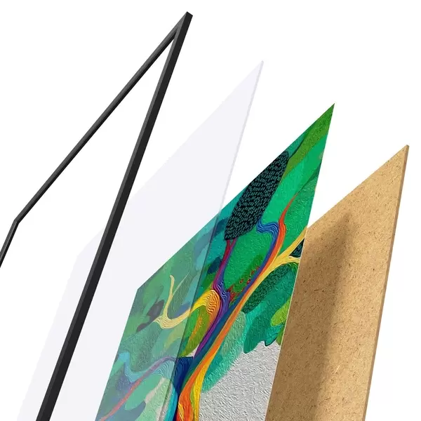 Plakatą sudaro rėmas, pleksiklas, atspausdintas vaizdas ir medžio drožlių plokštės pagrindas. Plakatą galima iš karto pakabinti ant sienos dėl kitoje pusėje esančių laikiklių.