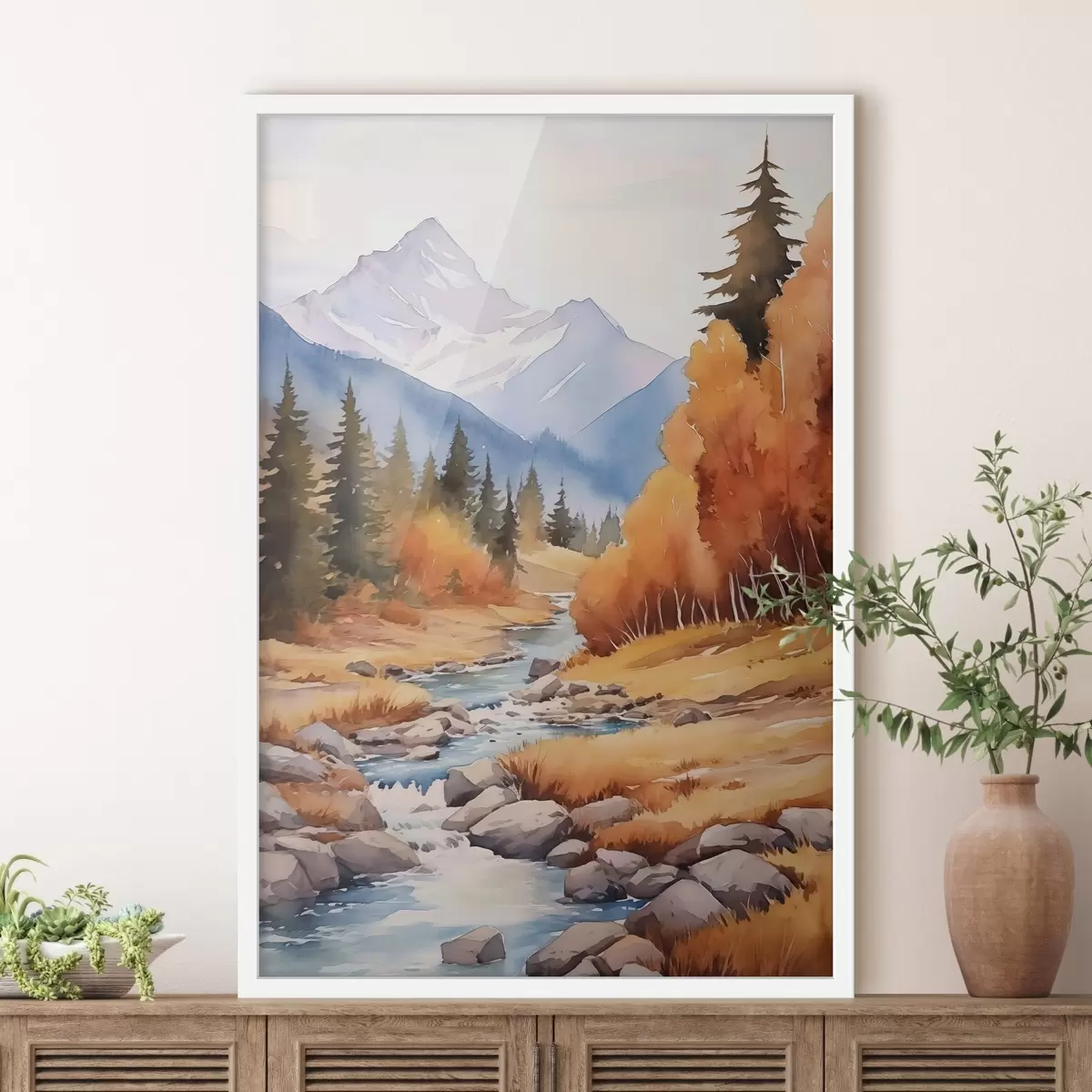 Plakatas Rudens kalnų peizažas su upe ir ryškiais miškais f46187
