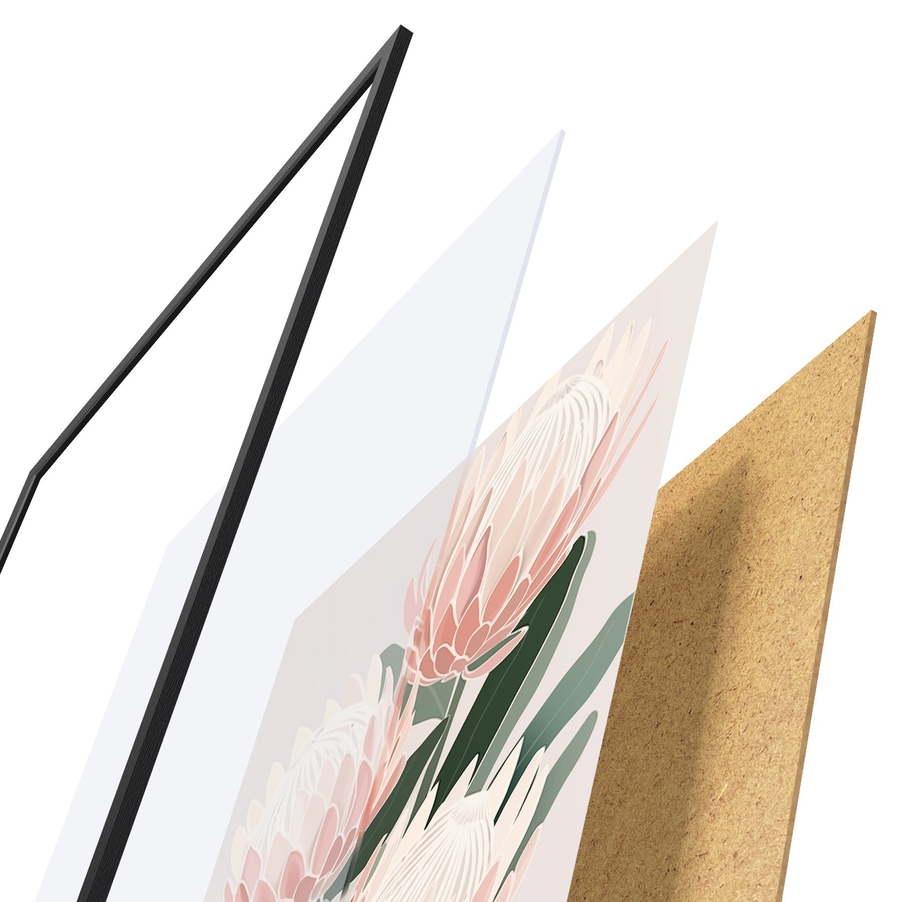 Plakatą sudaro rėmas, pleksiklas, atspausdintas vaizdas ir medžio drožlių plokštės pagrindas. Plakatą galima iš karto pakabinti ant sienos dėl kitoje pusėje esančių laikiklių.