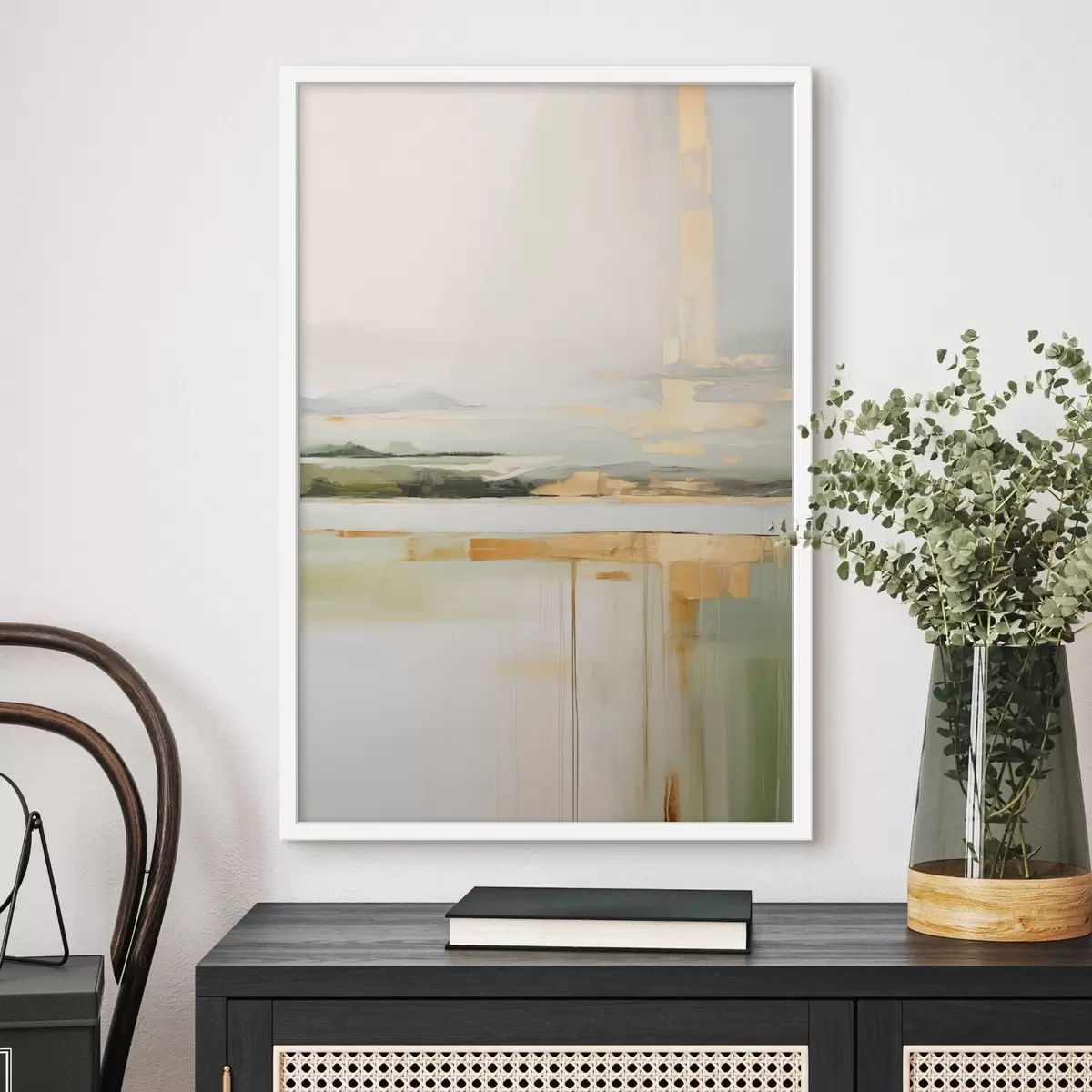 Plakatas Abstraktus peizažas su geltonais akcentais, minimalistinė žemės, vandens ir dangaus kompozicija, su prislopintomis spalvomis. f46268