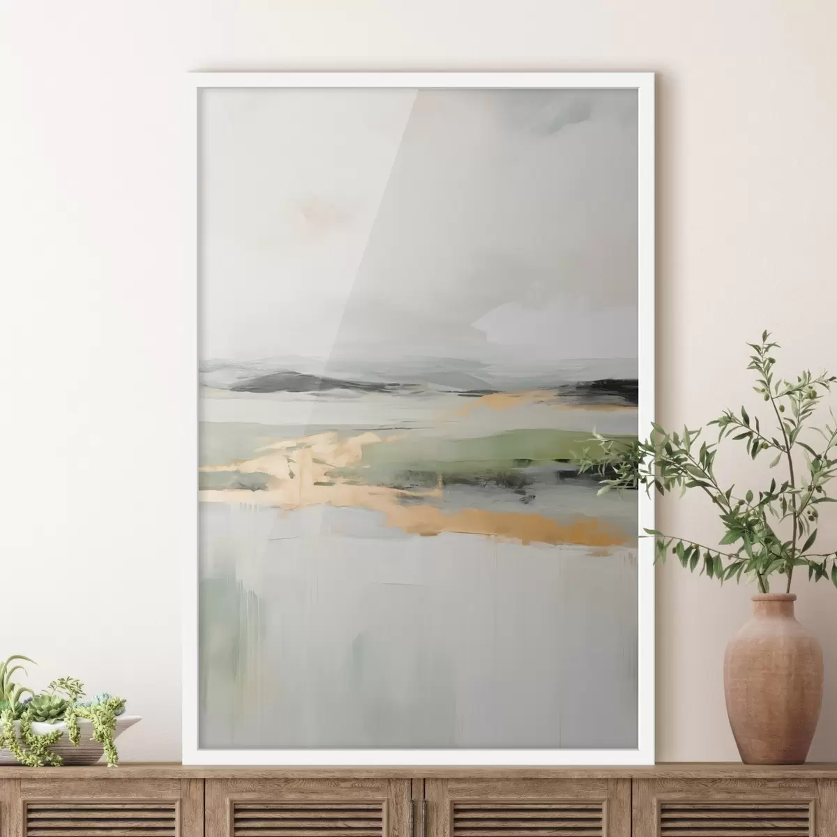 Plakatas Abstraktus peizažas su geltonais akcentais, minimalistinė žemės, vandens ir dangaus kompozicija, su prislopintomis spalvomis. f46269