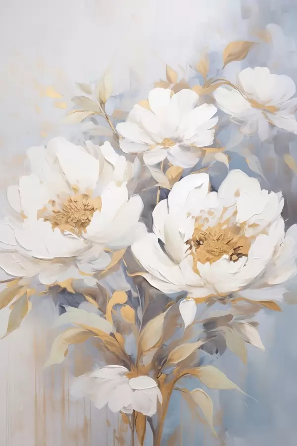 Plakatas Baltais žiedais ir mėlynais lapais puošti baltieji bijūnai, švelnūs potėpiai, šviesiai mėlynas fonas, gėlių kompozicija f46270