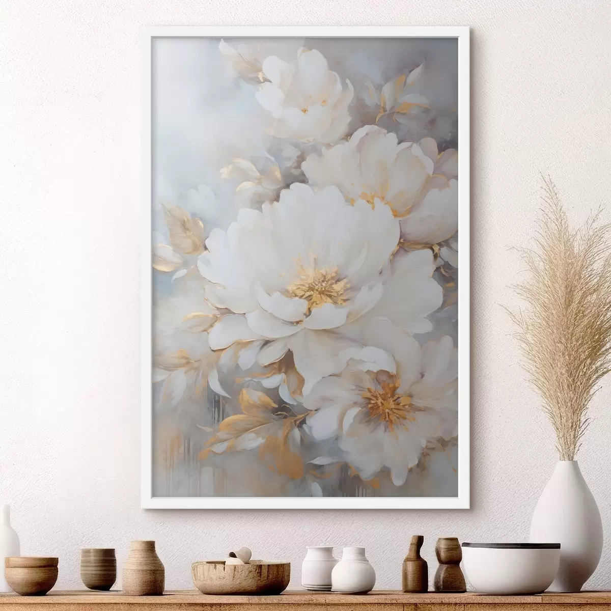 Plakatas Baltais žiedais ir mėlynais lapais puošti baltieji bijūnai, švelnūs potėpiai, šviesiai mėlynas fonas, gėlių kompozicija Ne f46271
