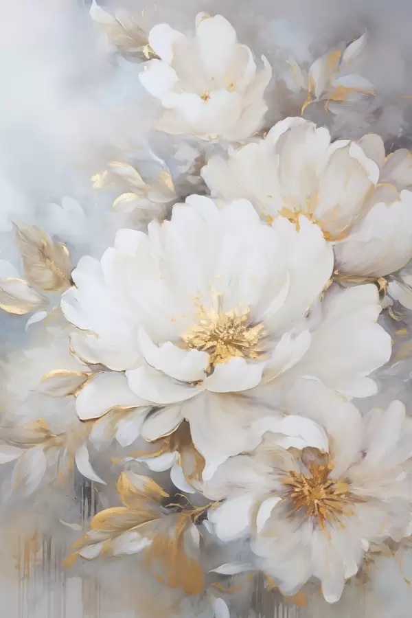 Plakatas Baltais žiedais ir mėlynais lapais puošti baltieji bijūnai, švelnūs potėpiai, šviesiai mėlynas fonas, gėlių kompozicija f46271