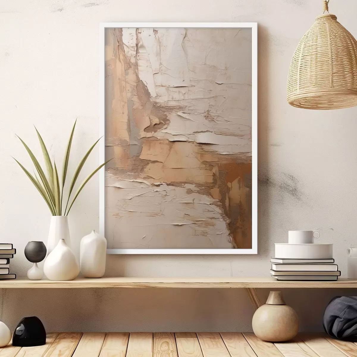 Plakatas Abstraktus paveikslas su storais potėpiais, smėlio ir rudos spalvos tonais, tekstūruotu paviršiumi, neutralių spalvų palete f46273