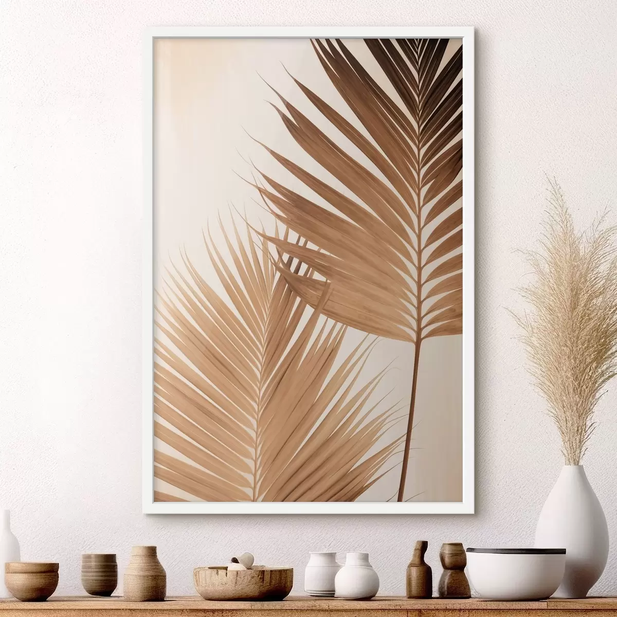 Plakatas Rudos spalvos palmių lapai, neutralus fonas, minimalistinis stilius, natūralus apšvietimas, tropinė atmosfera f46274