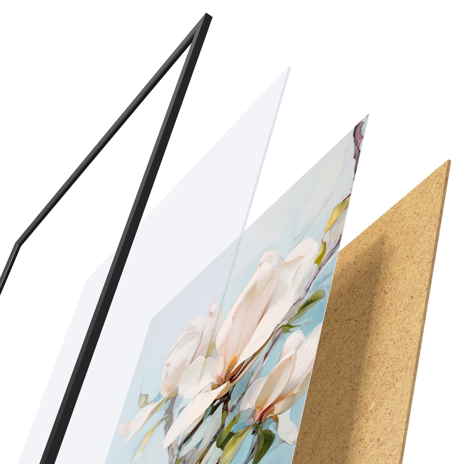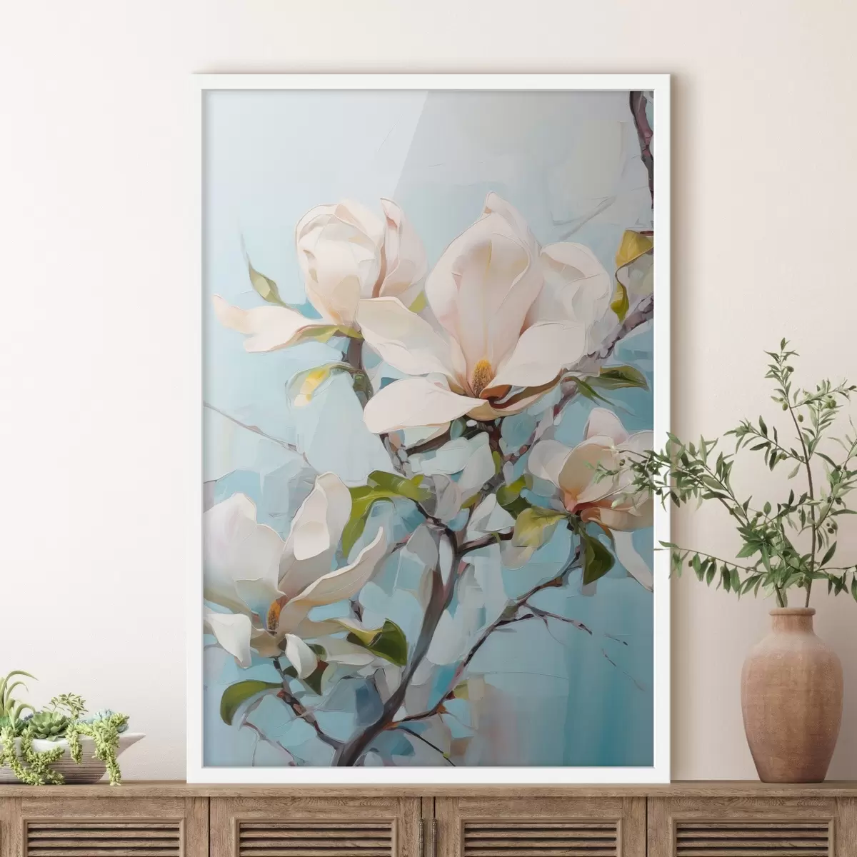 Plakatas Balta magnolija, šviesiai mėlynas fonas su švelniais teptuko potėpiais, aliejaus tapybos stilius, impasto tekstūra Ne f46277