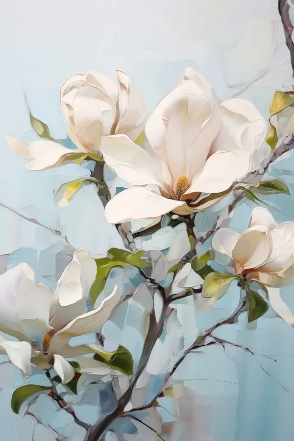 Plakatas Balta magnolija, šviesiai mėlynas fonas su švelniais teptuko potėpiais, aliejaus tapybos stilius, impasto tekstūra Ne f46277