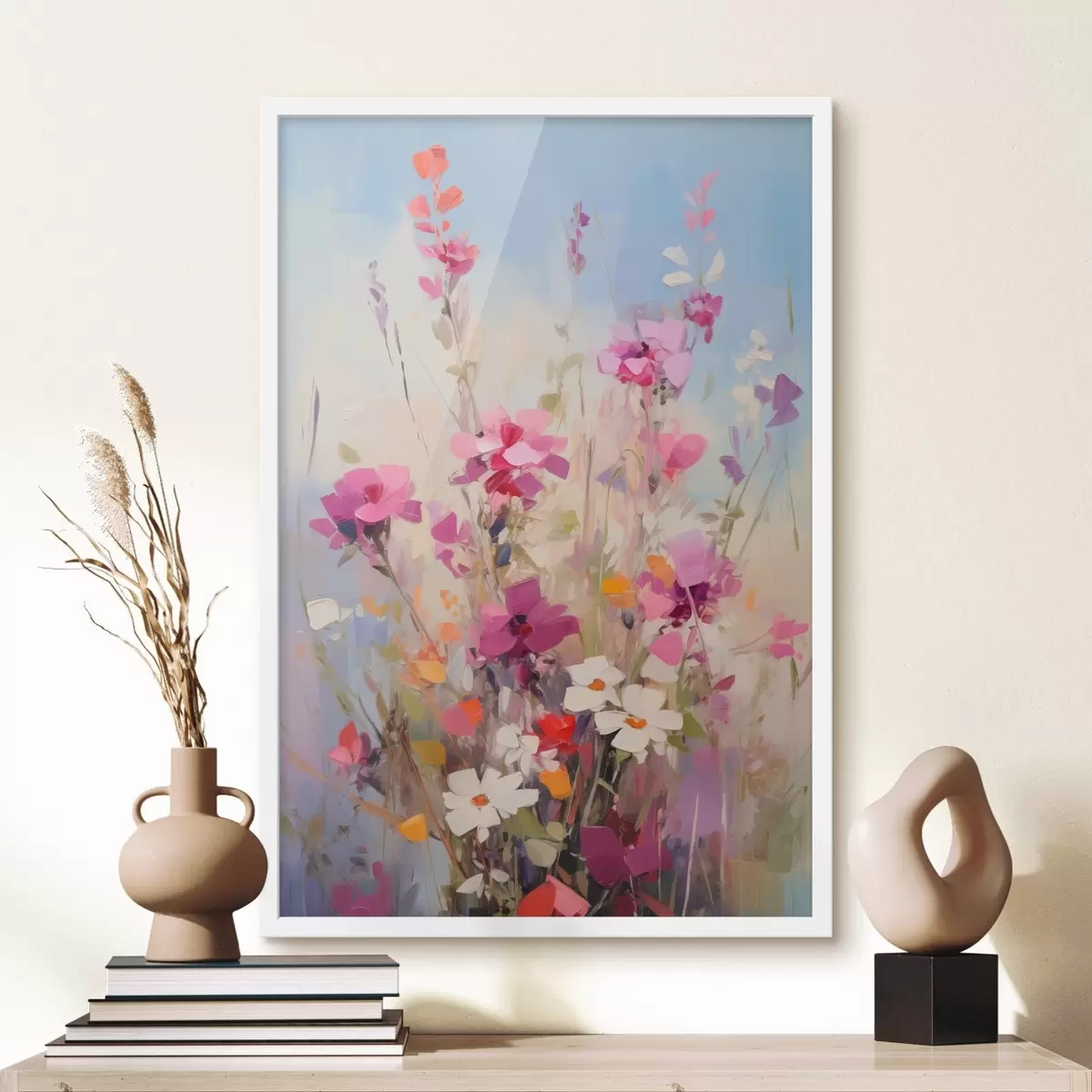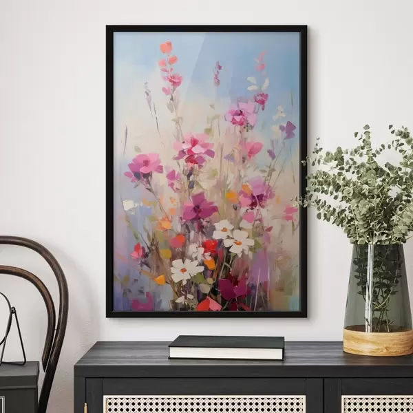 Plakatas Ryškiai rožinės, baltos ir žalios gėlės ant švelnaus, pastelinės spalvos fono f46278