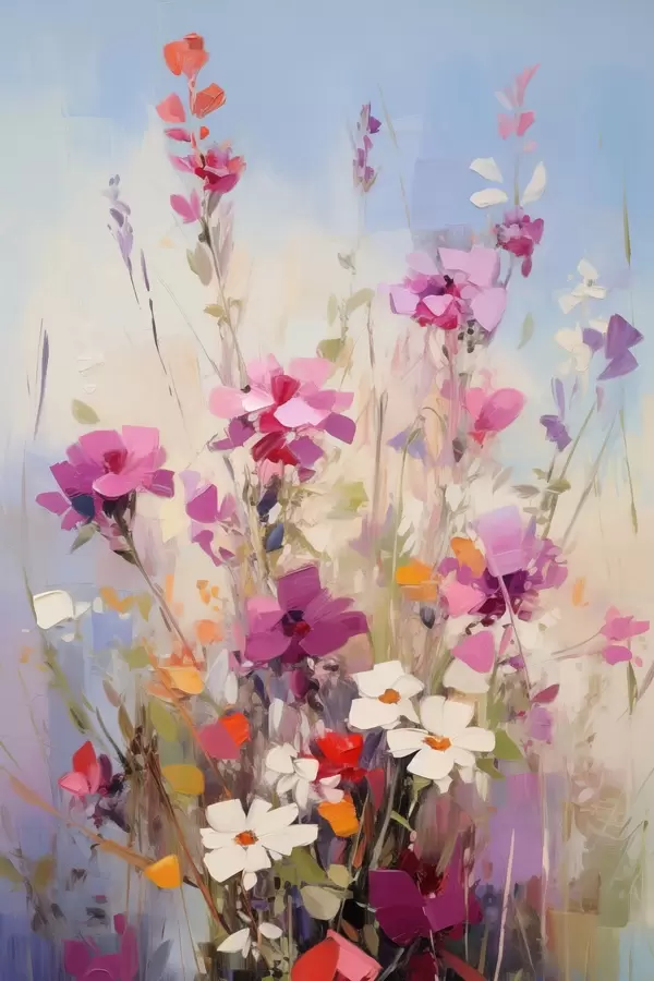 Plakatas Ryškiai rožinės, baltos ir žalios gėlės ant švelnaus, pastelinės spalvos fono f46278