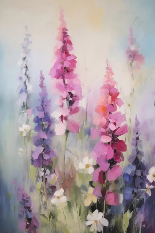 Plakatas Rožinės ir violetinės gėlės su baltomis saulėgrąžomis lauke, švelnūs teptuko potėpiai, pastelinės spalvos, impresionistinis stilius Ne f46279