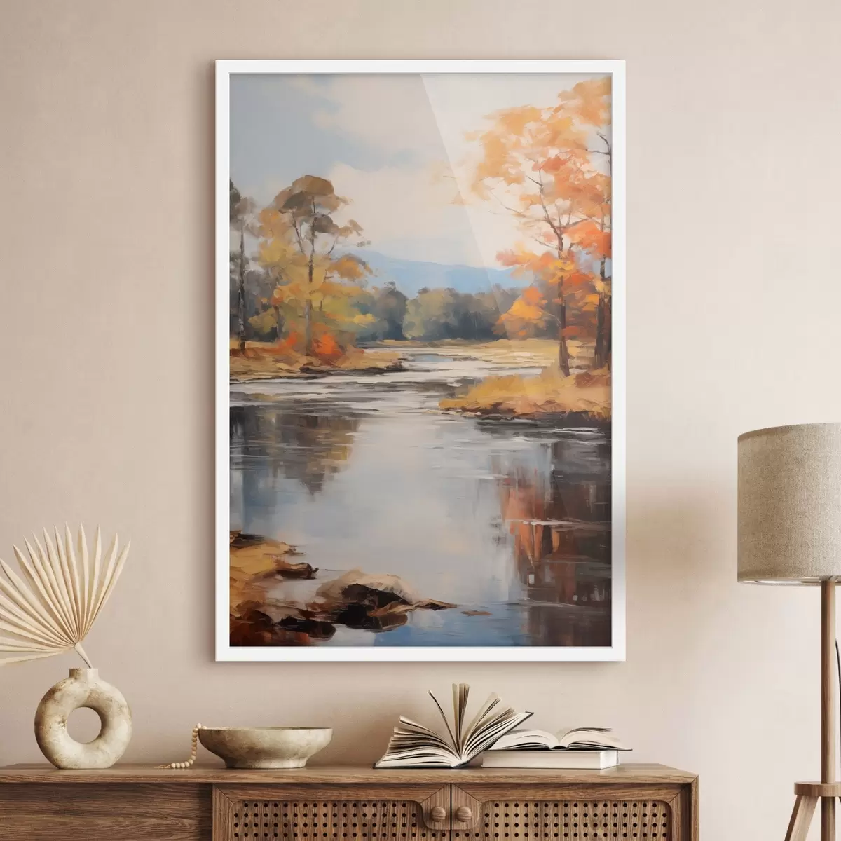 Plakatas Pejzažas su upeliu, tekančiu per rudenį mišką, geltonais ir oranžiniais medžiais, tapybos stilius Ne f46281