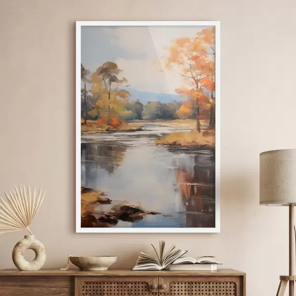Plakatas Pejzažas su upeliu, tekančiu per rudenį mišką, geltonais ir oranžiniais medžiais, tapybos stilius f46281