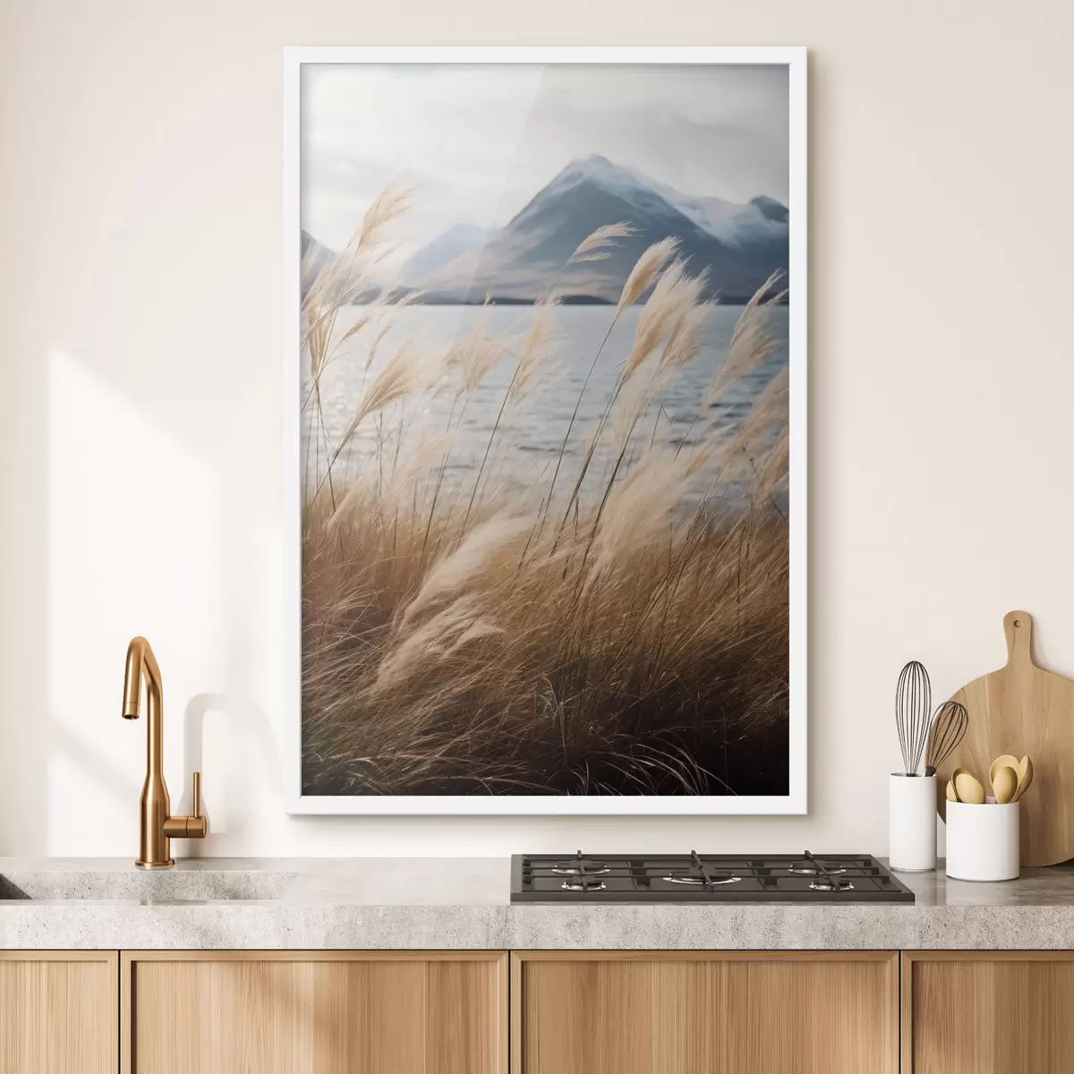 Plakatas Pampų žolė su ežeru ir kalnais fone, švelnus apšvietimas, prislopintos spalvos, natūralistinis stilius f46283