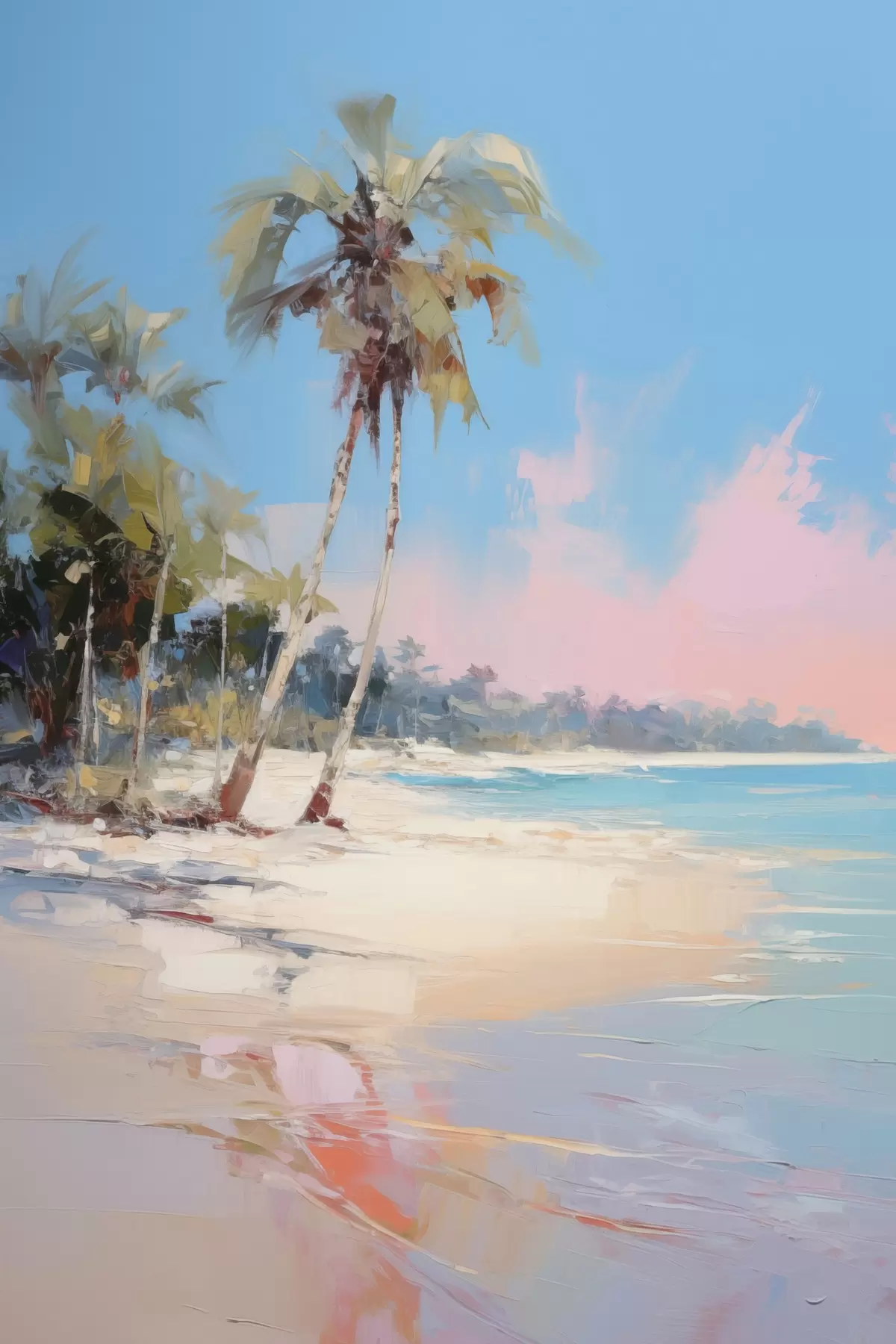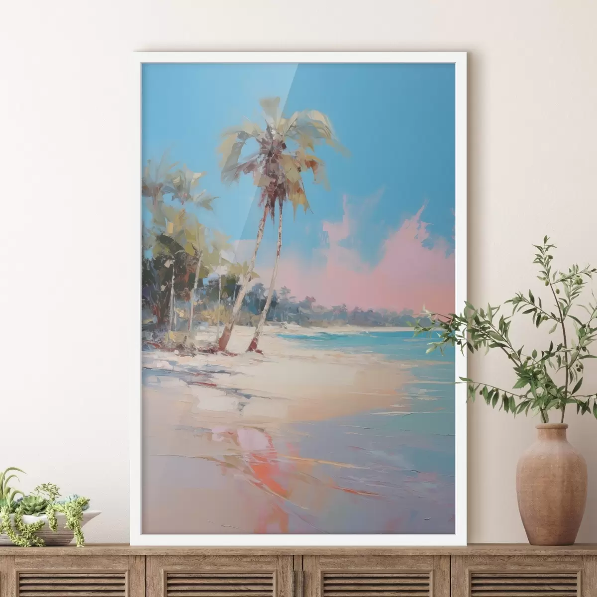 Plakatas Abstraktus tropinis paplūdimys su balto smėlio ir palmių, mėlynas dangus su baltais debesimis f46285