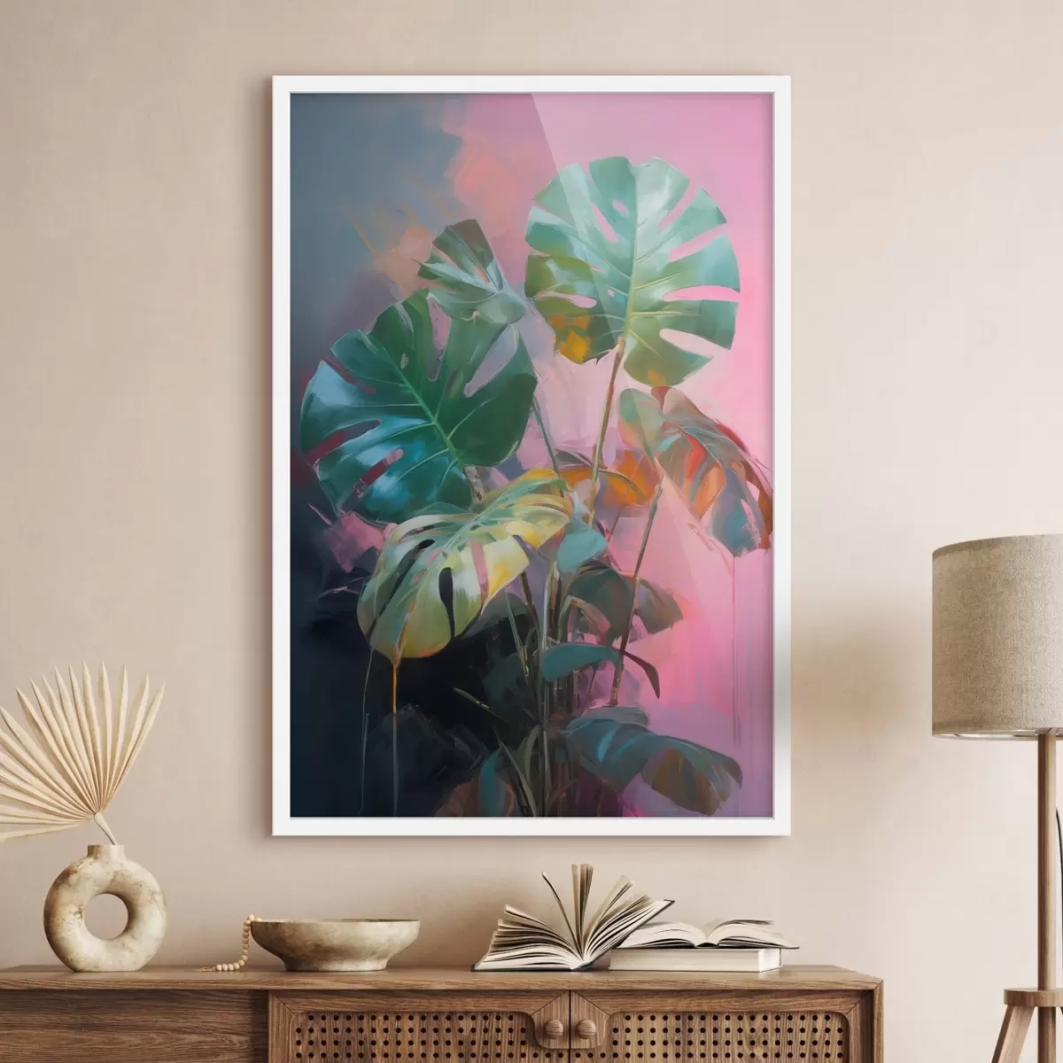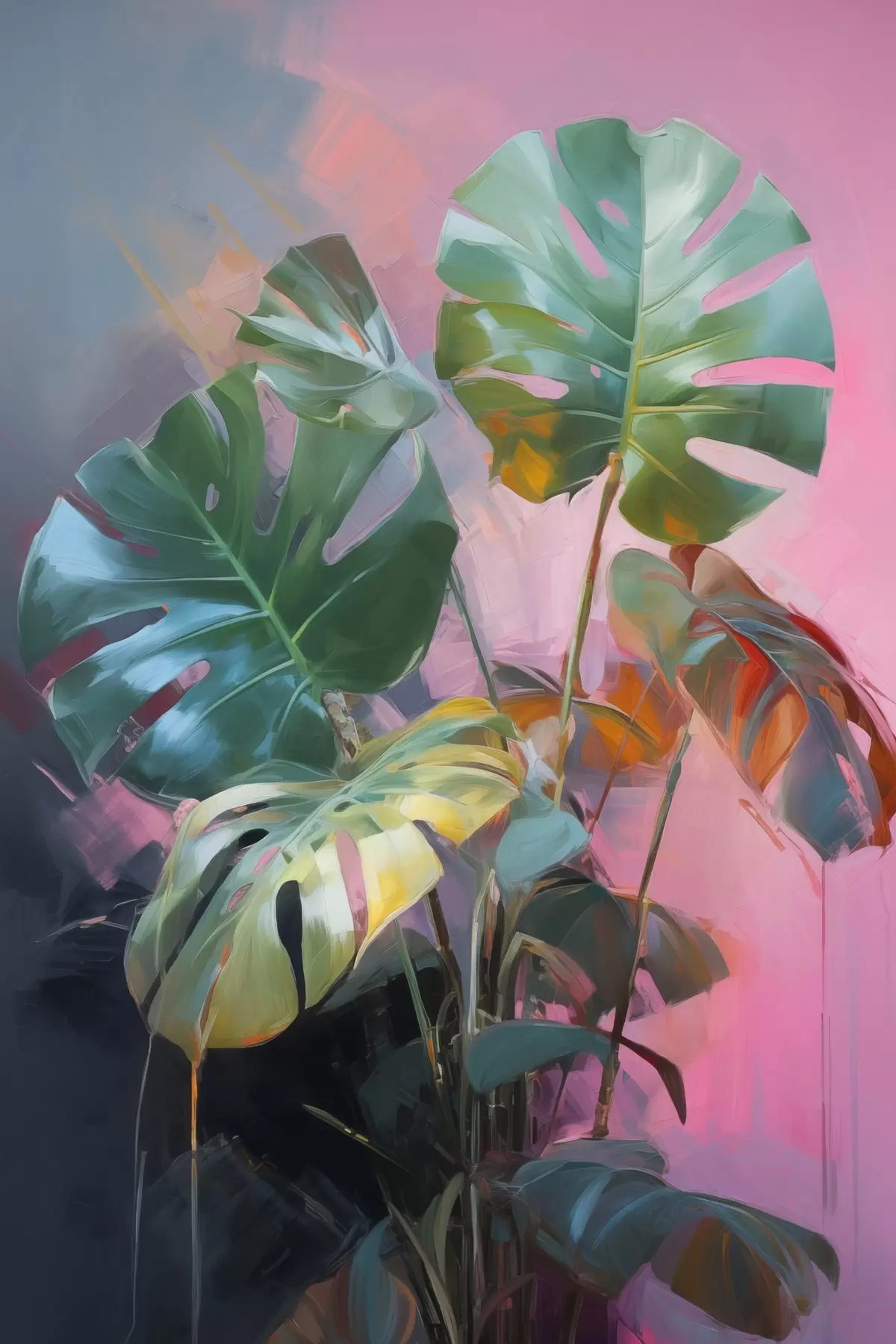 Plakatas Abstraktaus monstera augalo su ryškiai žaliais lapais, švelnių rožinių ir violetinės spalvų atspalvių fone f46286