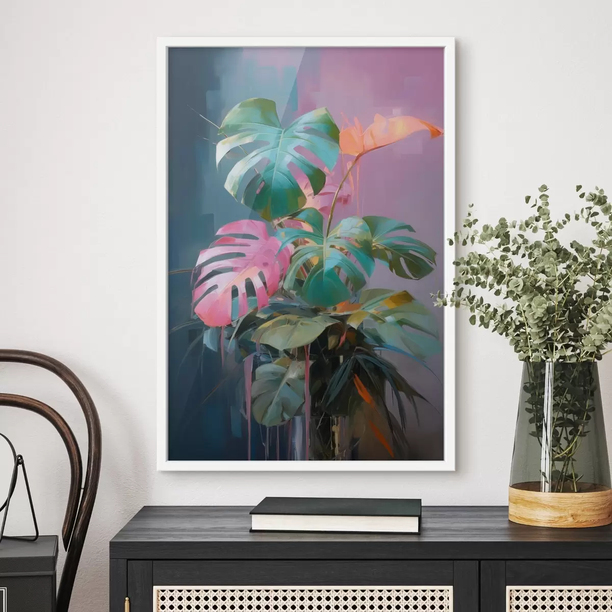 Plakatas Abstraktaus monstera augalo su rožiniais ir žaliais lapais, ryškiomis spalvomis, prieš neryškų foną f46287