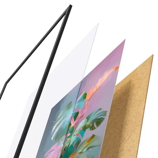 Plakatą sudaro rėmas, pleksiklas, atspausdintas vaizdas ir medžio drožlių plokštės pagrindas. Plakatą galima iš karto pakabinti ant sienos dėl kitoje pusėje esančių laikiklių.