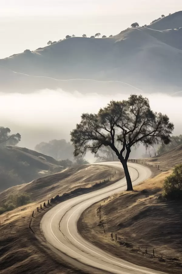 Plakatas Vingiuotas kelias per banguotas kalvas su medžiu priešakyje, fone – rūkas ir kalnai f46288