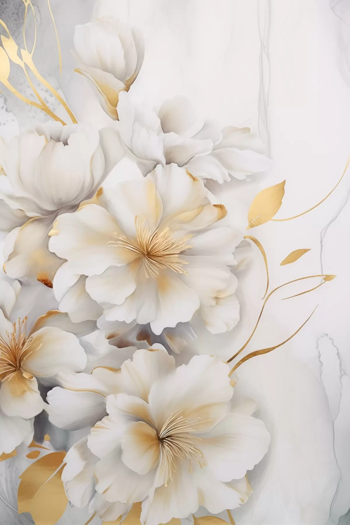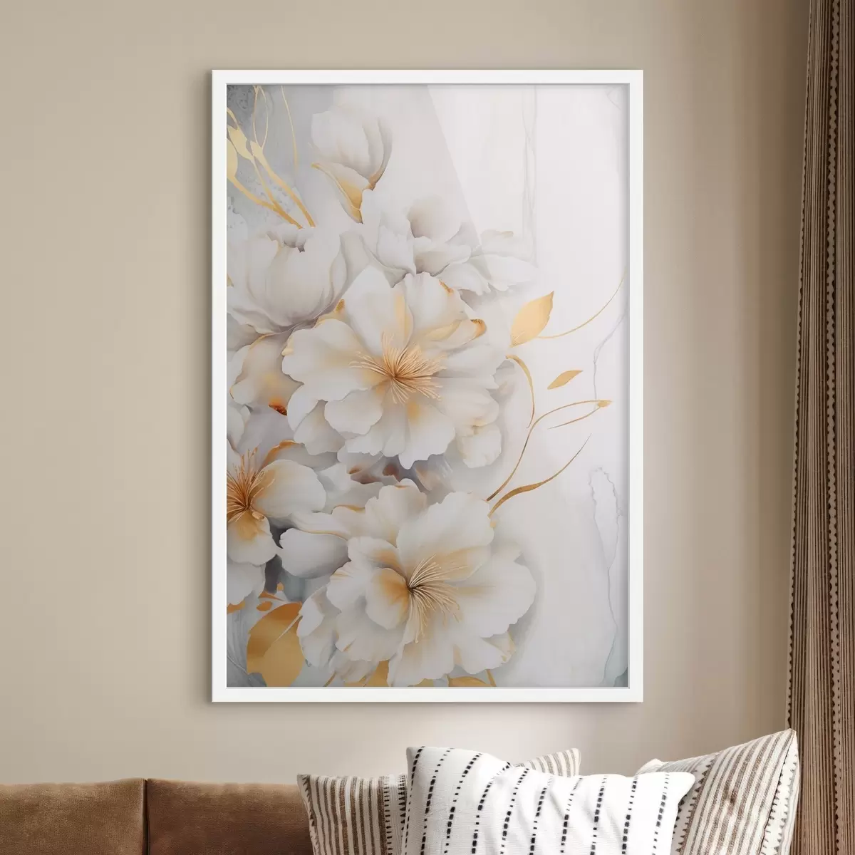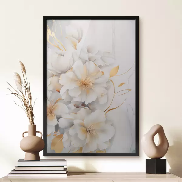 Plakatas Balta gėlė su geltonomis detalėmis, žiedlapiai su subtiliais šešėliais, šviesus fonas su subtiliu marmuro efektu Ne f46292