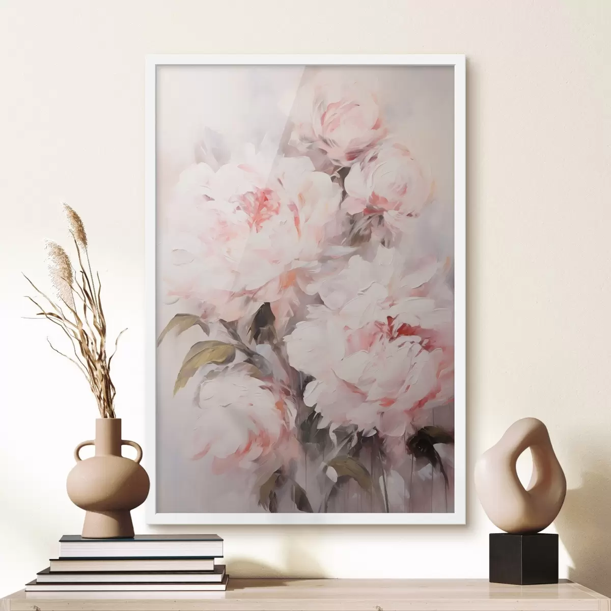 Plakatas Šviesiai rožinių bijūnų puokštė su žaliais lapais, švelniais potėpiais, pastelinėmis spalvomis, šviesiu fonu Ne f46294