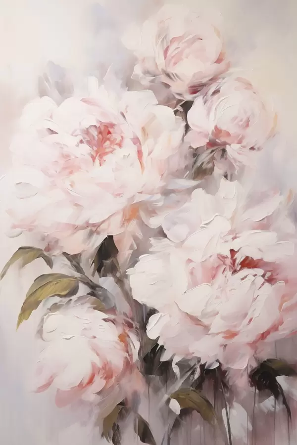 Plakatas Šviesiai rožinių bijūnų puokštė su žaliais lapais, švelniais potėpiais, pastelinėmis spalvomis, šviesiu fonu Ne f46294