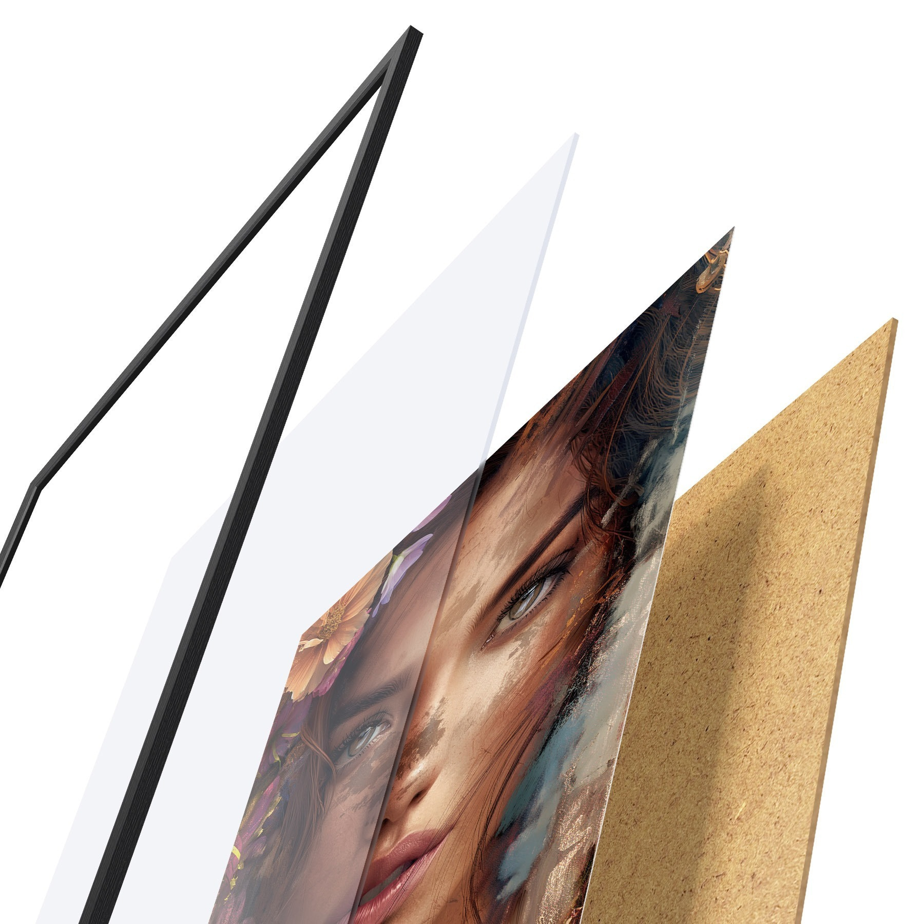 Plakatą sudaro rėmas, pleksiklas, atspausdintas vaizdas ir medžio drožlių plokštės pagrindas. Plakatą galima iš karto pakabinti ant sienos dėl kitoje pusėje esančių laikiklių.
