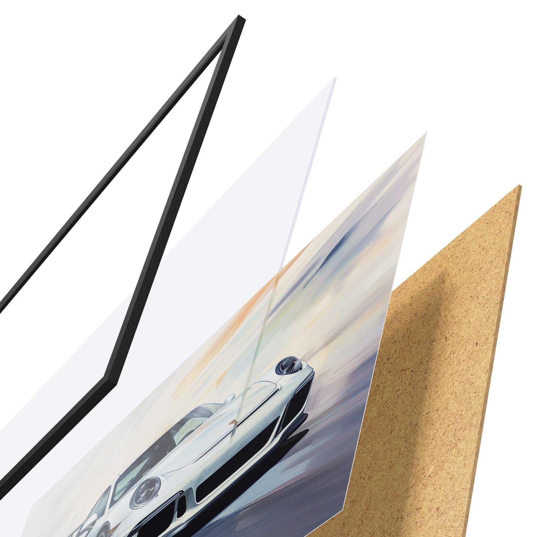 Plakatą sudaro rėmas, pleksiklas, atspausdintas vaizdas ir medžio drožlių plokštės pagrindas. Plakatą galima iš karto pakabinti ant sienos dėl kitoje pusėje esančių laikiklių.